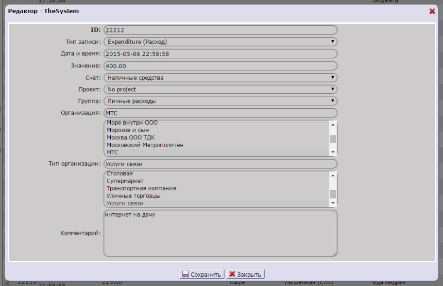 Окно бухгалтерии (транзакций):